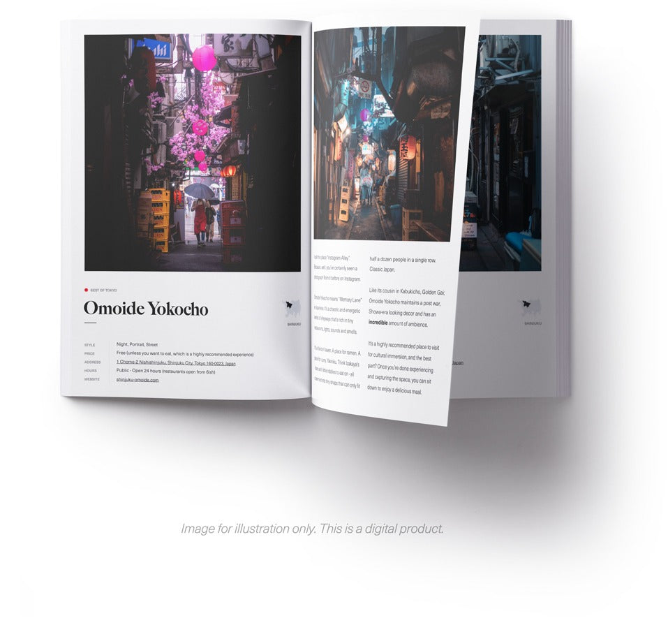 - Complete with location descriptions, photography notes, suggested styles of photography, tripod usage, best times to shoot, prices, open hours, addresses and websites